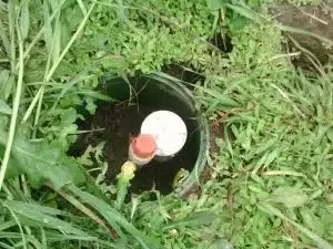Here is a monitoring port on a septic’s pressurized drainfield. Now you can ask, what is it telling me. There are three monitoring ports on this drainfield, and a squirt test must be performed. This is to make sure that the entire drainfield is taking the wastewater equally. If I turn on the pumps and the 3 monitoring ports squirt up water at the same level, then it is working equally. If we were to get one that was squirting 6 inches, and the other two are squirting 5 feet, then there’s a problem.
